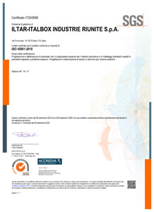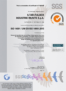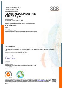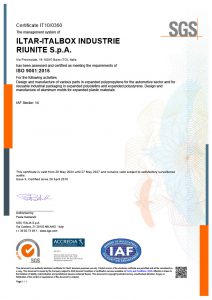 Iltar-Italbox è certificata secondo la norma IATF 16949:2016 specifica per il settore automotive e secondo la norma UNI EN ISO 9001:2015 per la progettazione e la fabbricazione degli articoli in polistirolo e polipropilene espansi e per la progettazione e costruzione degli stampi.